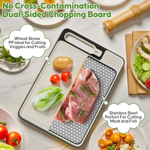 PKBD Chopping Boards for Kitchens,Double Sided 304 Food-Grade Stainless Steel Chopping Board and Wheat Straw Chopping Boards,Cutting Board for Meat &Vegetables,Non Toxic Hygienic Safe,Dishwasher Safe