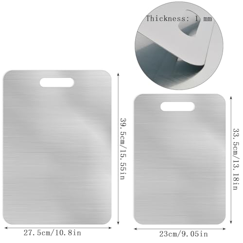 【Two-Size Combo Set】: The chopping board set includes two pieces (39.5×27.5cm and 33.5×23cm), stainless steel kitchen chopping board can fulfill different scenarios: The large stainless cutting board for meat processing, the small pure cutting board for fruits/vegetables, enabling rational allocation.