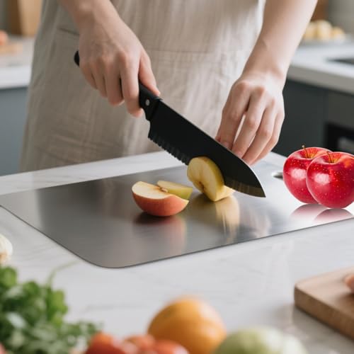 The smooth surface of stainless steel chopping boards for kitchens enables effortless cleaning, kitchen boards retains no food residue, stainless chopping board is dishwasher-compatible, stainless steel chopping board for kitchen maintains hygiene for long-term use.