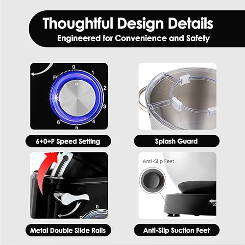 【6+PULSE SPEED & TILT-HEAD DESIGN】The kitchen mixer with 6-speed control access to multipurpose and a variety of recipes. Pulse can reach the highest speed in a second, used to beat egg whites. The tilt-head design mixer allows access to install or uninstall bowl and accessories easily.