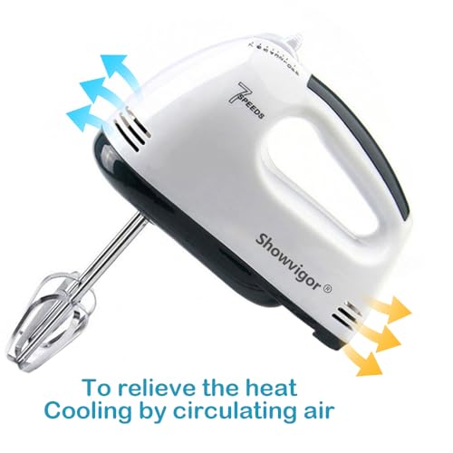 【7 Speeds&Turbo Boost】Hand mixers has 7 adjustable speeds. And You can use the turbo boost function to the fastest acceleration to speed 5 or higher. Showvigor hand mixer help you operate more efficiently and quickly. Note: Starting the electric mixer at a slow speed will effectively prevent splashing of ingredients.
