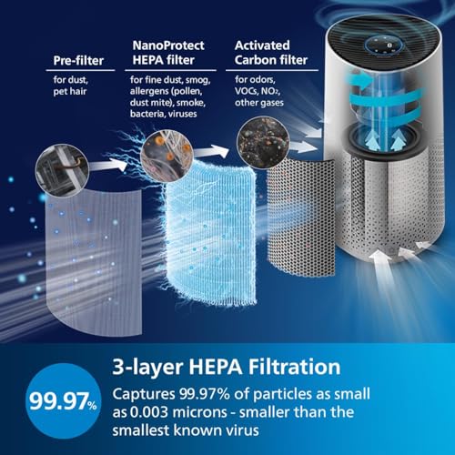 ADVANCED 3-LAYER HEPA FILTRATION – Captures 99.97% of ultra-fine particles as small as 0.003 microns; Philips NanoProtect HEPA cleans 2x more air than traditional HEPA H13 (3)
