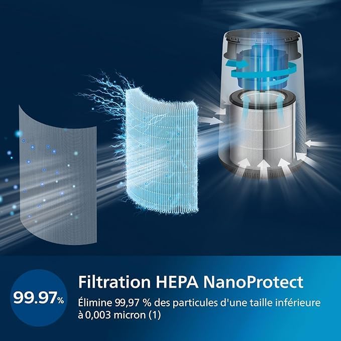 99.97% particle removal at 0.003 microns(1): NanoProtect HEPA technology traps pollutants and uses an electrostatic charge to attract them, purifying up to 2 times more air than conventional HEPA H13 filters(5)